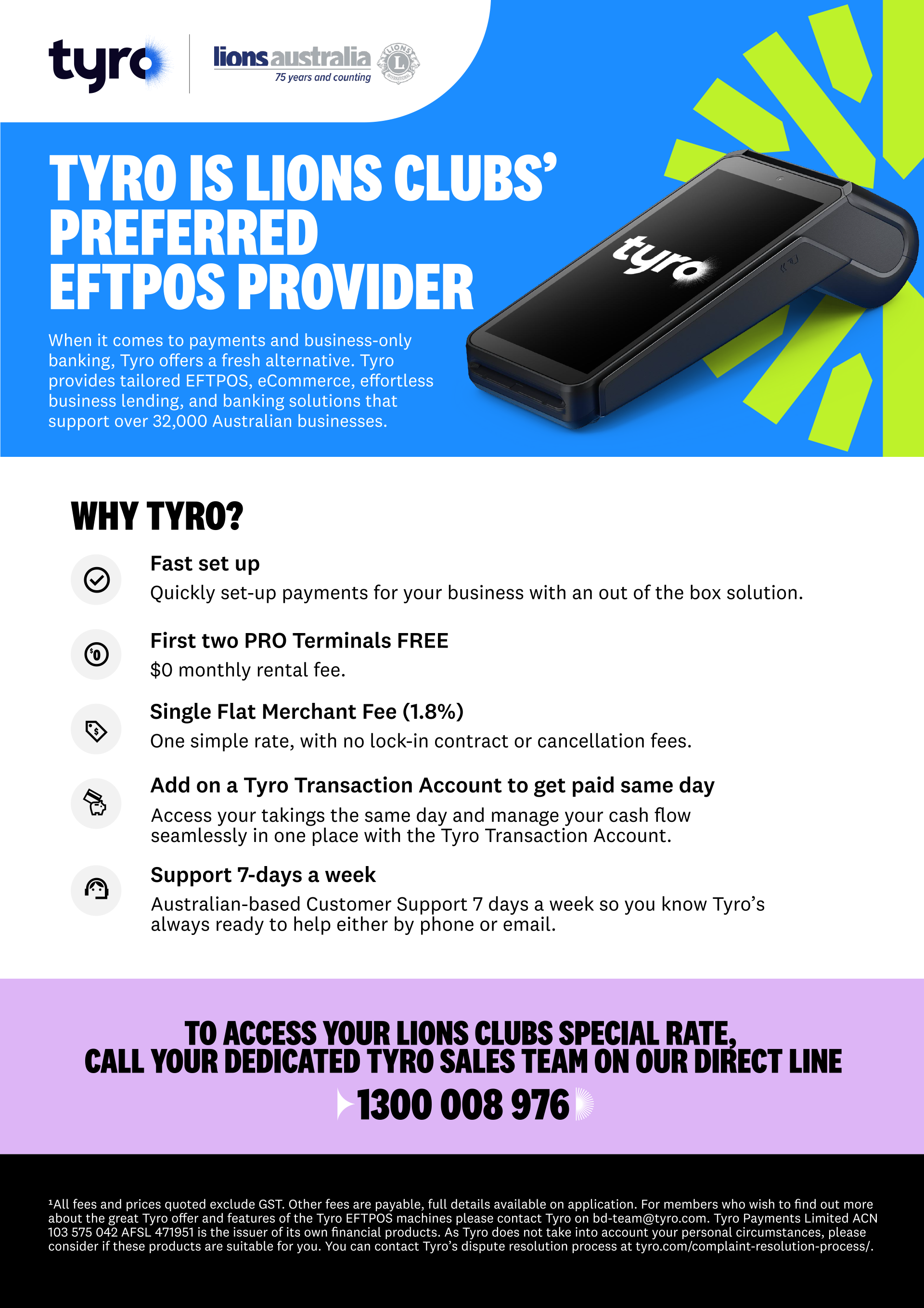 Updated flyer about the Tyro EFTPOS machines offered to Lions Clubs.