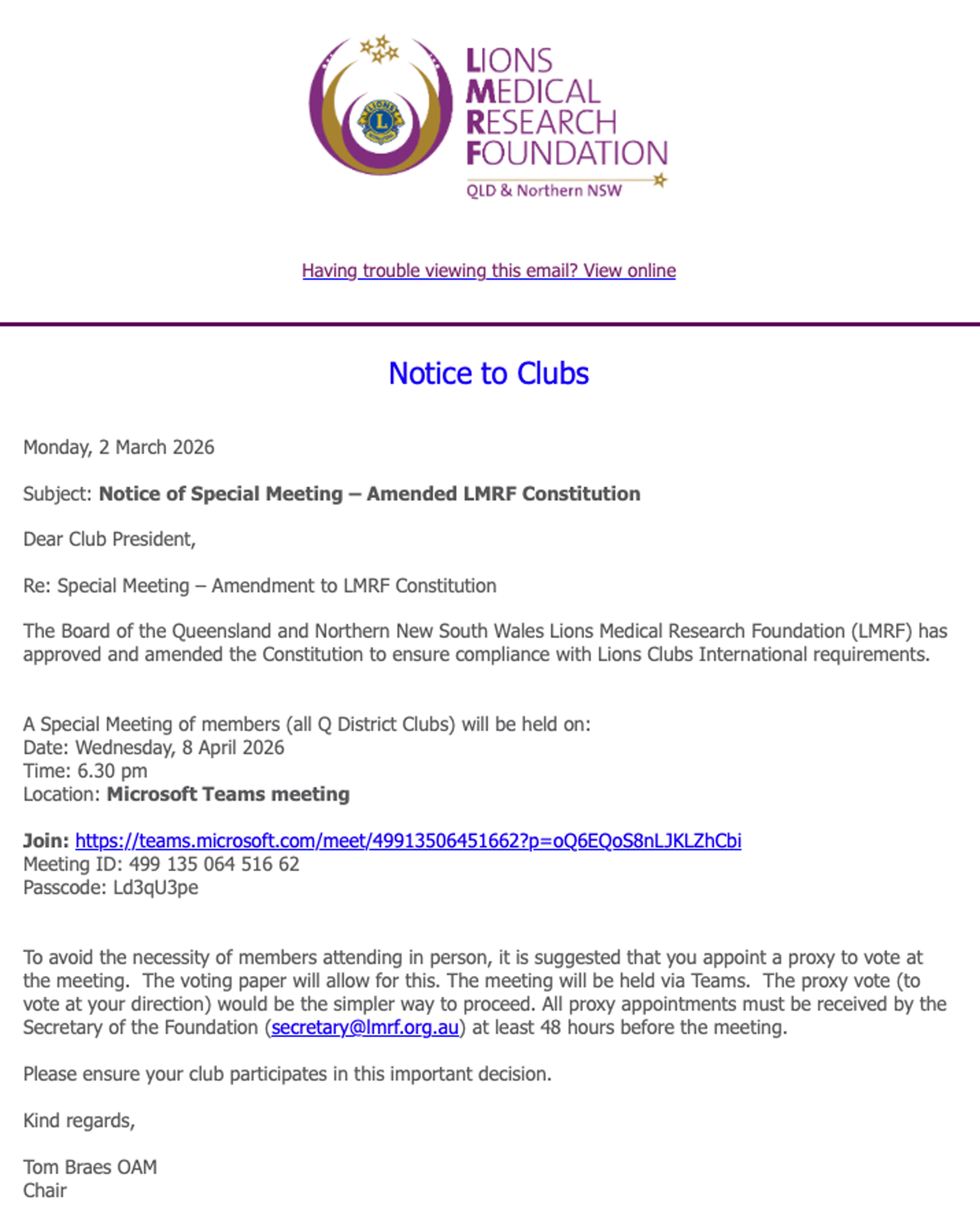 A Special Meeting of members (all Q District Clubs) will be held on: