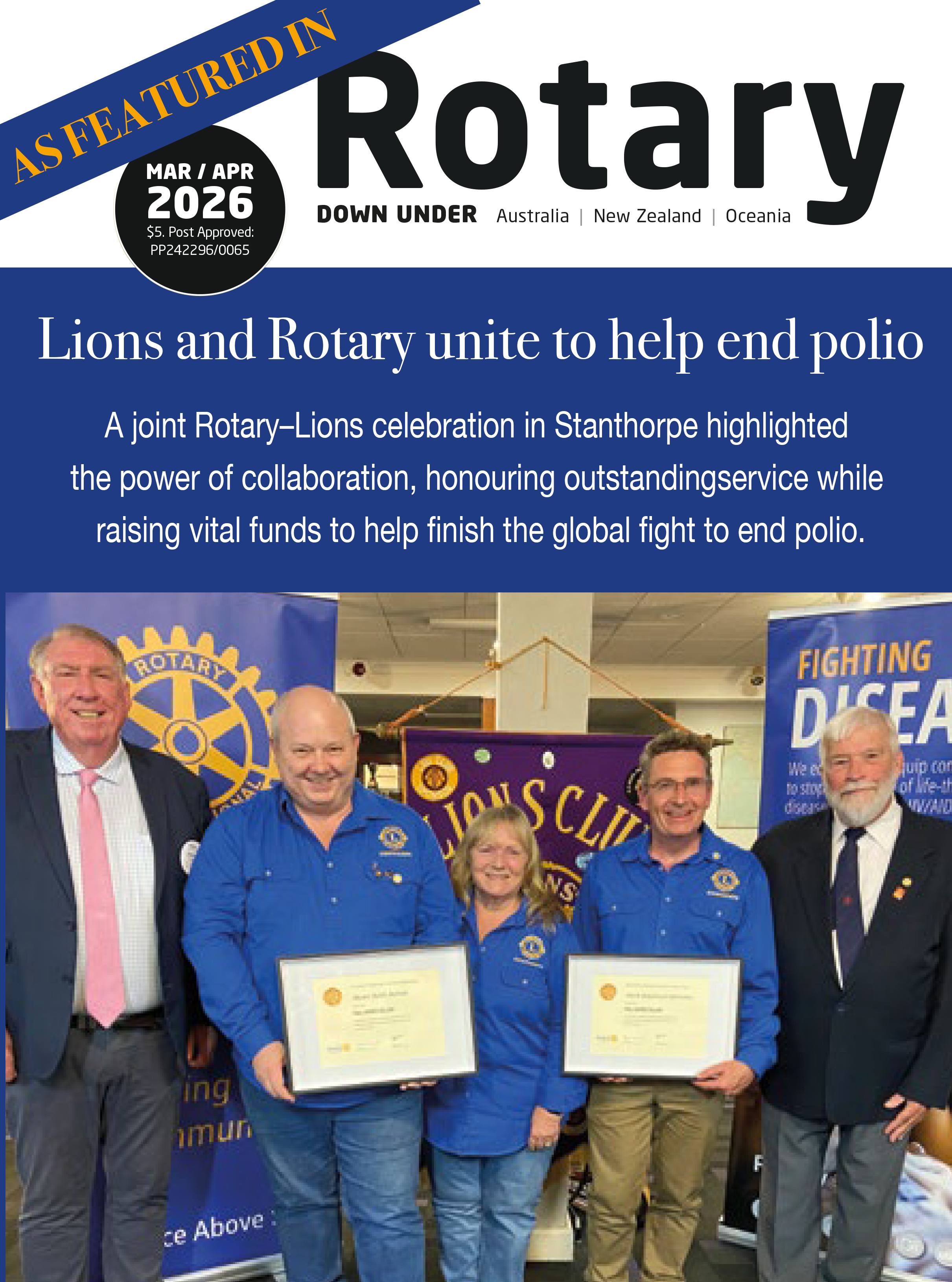 A joint Rotary–Lions celebration in Stanthorpe highlighted the power of collaboration, honouring outstanding service while raising vital funds to help finish the global fight to end polio.