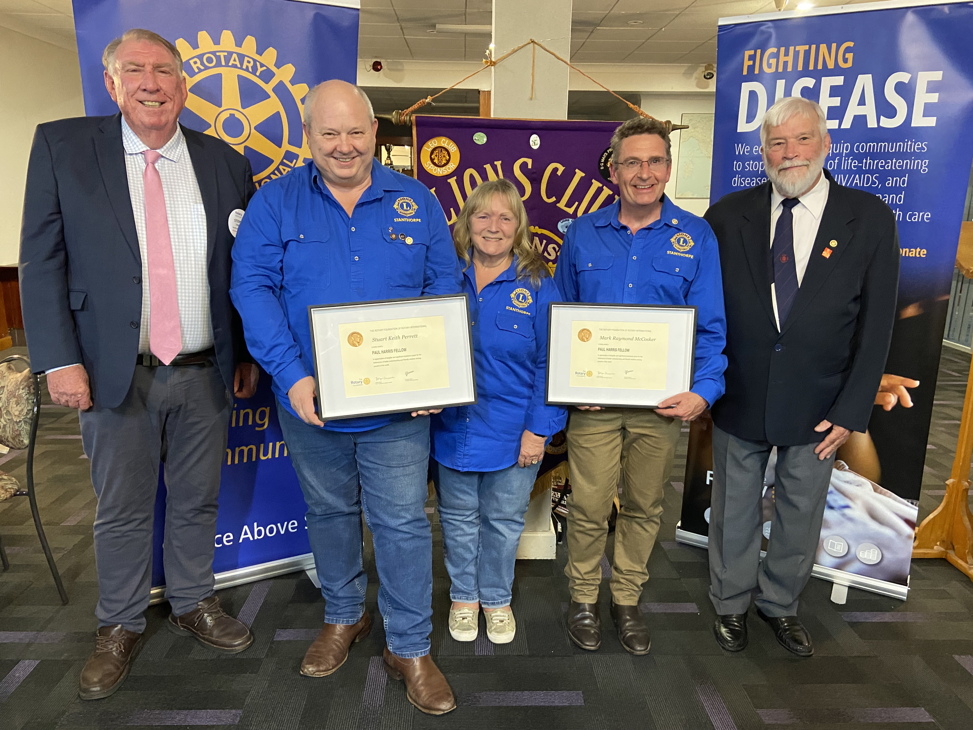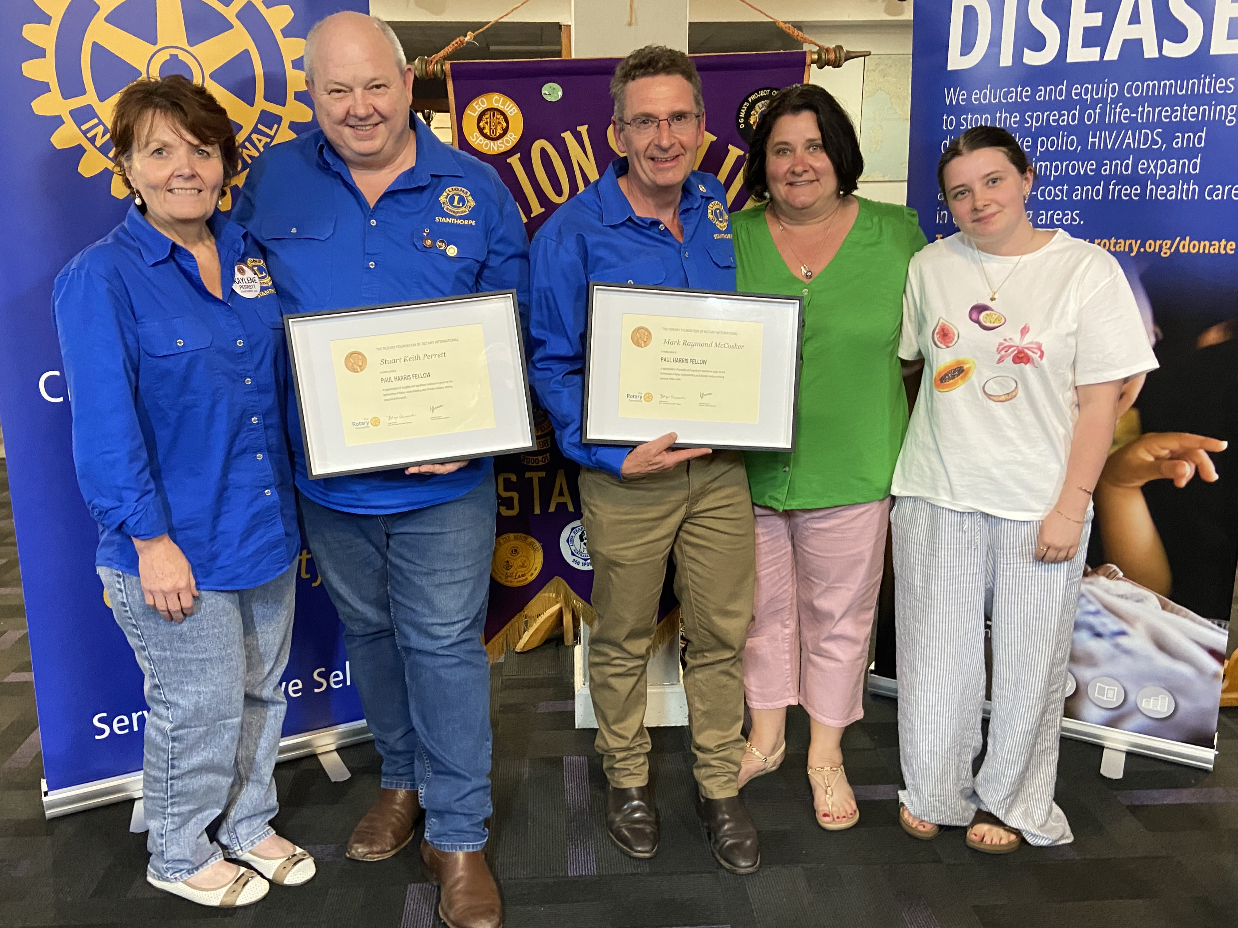 AT a recent joint meeting of the Rotary and Lions Clubs of Stanthorpe, Qld, two Lions were honoured with Paul Harris Fellowships and significant funds were raised for The Rotary Foundation’s PolioPlus campaign.
