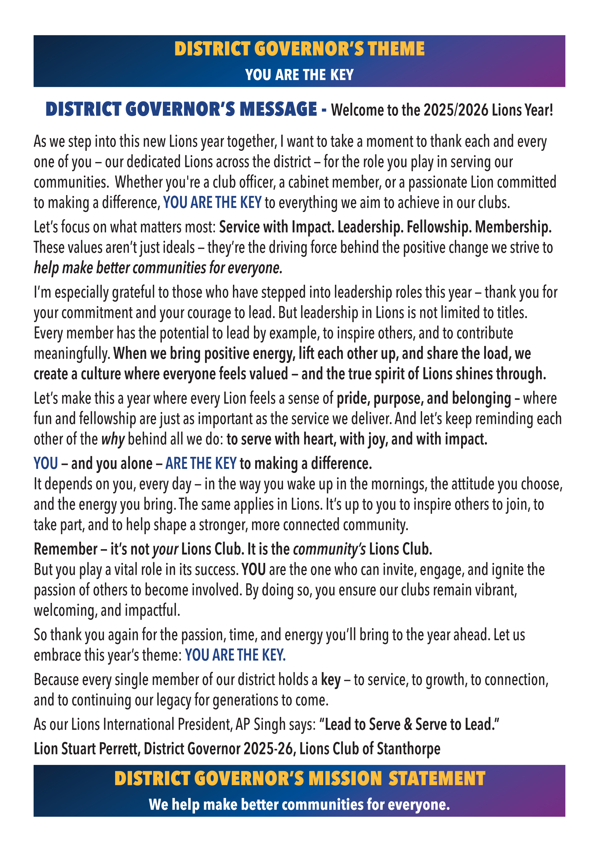 Profiles of the District Governor team. Please download in preparation for DG visits.